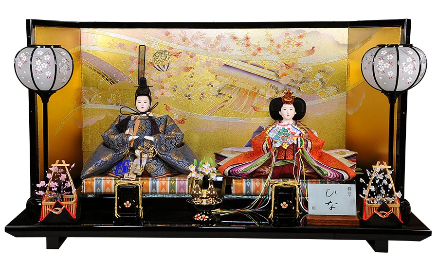 金箔金彩屏風本装仕立の屏風に正絹有職文様のお雛様