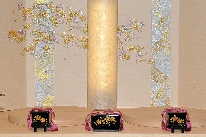 刺繍と金彩を配した屏風に刺繍衣装のお雛様です。屏風の中央にはLED照明が灯ります。