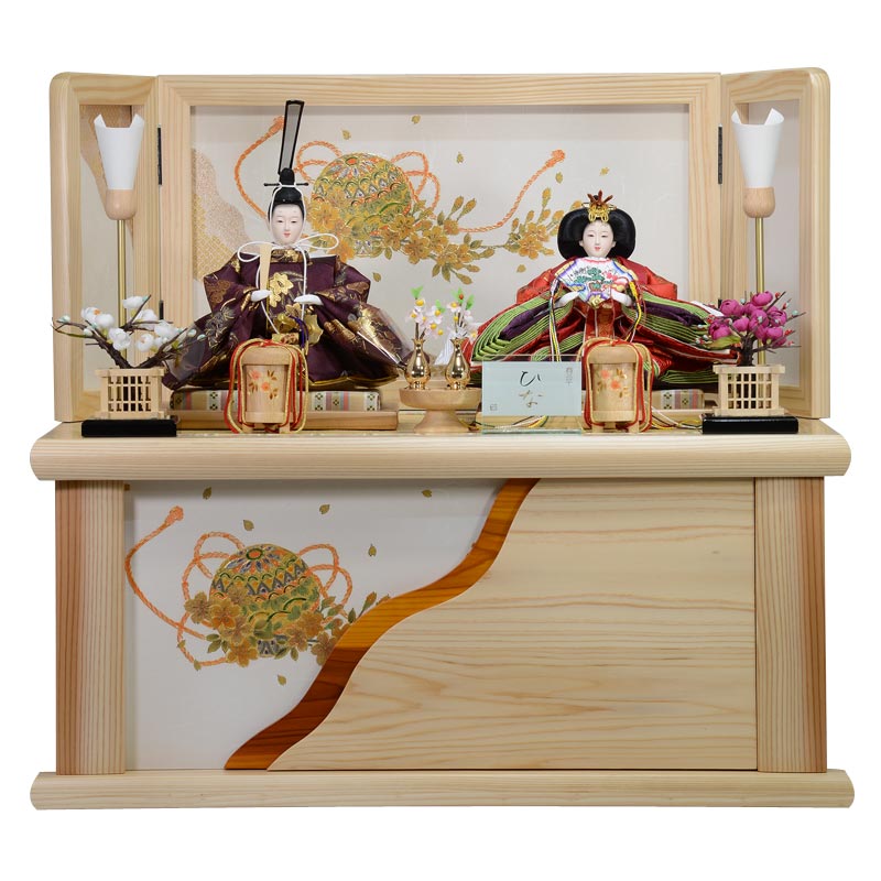 天竜杉を使った収納飾りです。シックな紫地の金襴と緑重ね仕様。