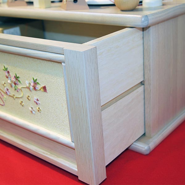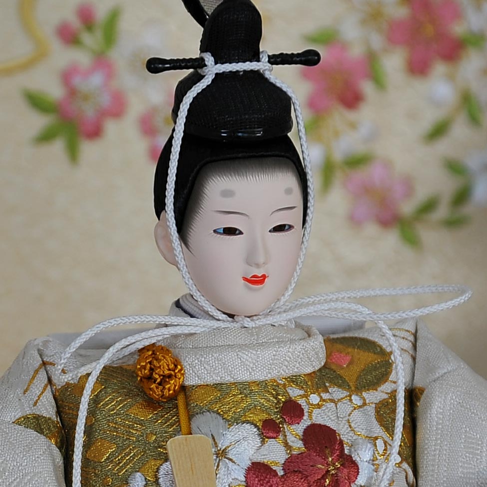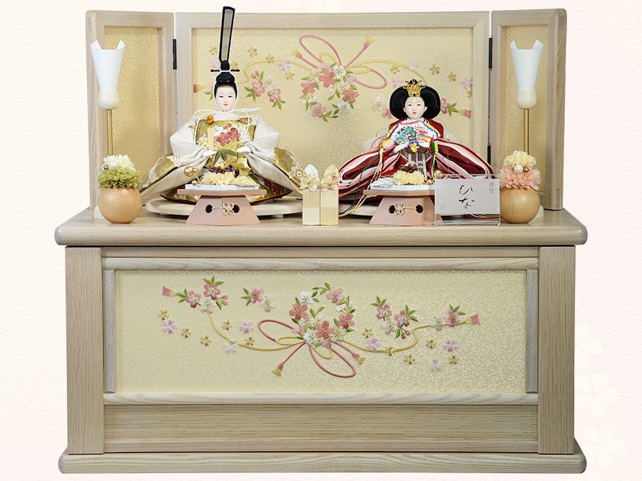 ホワイトオーク塗りの収納箱に金彩刺繍親王飾り。綺麗な刺繍衣装と上品な造りのお人形です。収納は引き出し式になっているので出し入れがとても楽です。