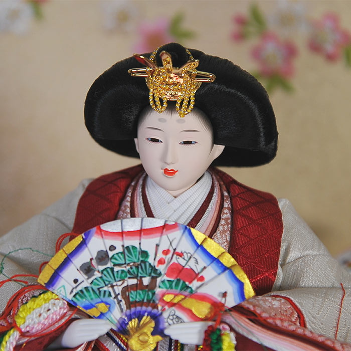 - 端正なお顔と金彩刺繍のお衣装のおひな様。